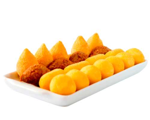 Coxinha, Bolinha de queijo, Enroladinho de salsicha, Quibe, Queijo com presunto, Aipim com carne, Alho poró, Palmito com catupiry, Risole de camarão.