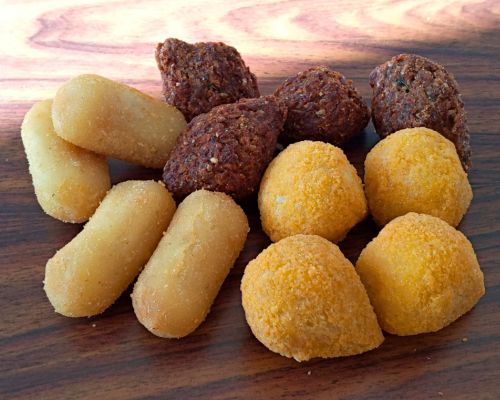 Salgadinhos diversos, crocantes. Prático e saboroso prontinho para fritar.